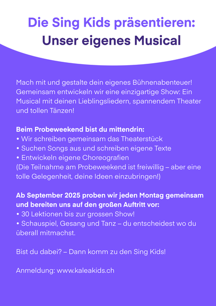 Da wir im Kinderchor eine Show einstudieren werden, ist die Teilnahme für das ganze Schuljahr Bedingung. Ein Einstieg ist auch während des laufenden Schuljahres möglich, vorausgesetzt es sind freie Plätze verfügbar.